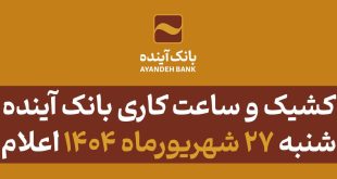 به گزارش باتونیوز به نقل ازروابط عمومی بانک آینده، با توجه به اعلام استانداریهای سراسر کشور و اعلام کانون بانکها و موسسات اعتباری خصوصی، بدین وسیله فهرست شعب کشیک و ساعات کاری این بانک در روز پنجشنبه 27 شهریورماه 1404 به شرح زیر اعلام میگردد: فهرست شعب کشیک استان تهران …