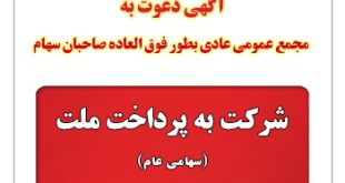 بدینوسیله از تمامی سهامداران محترم شرکت به پرداخت ملت ( سهامی عام) وکیل یا قائم مقام قانونی صاحبان سهام و همچنین نمایندگان اشخاص حقوقی دعوت میشود تا در جلسه مجمع عمومی عادی بطور فوق العاده این شرکت که در ساعت 10 صبح روز چهارشنبه پنجم اردیبهشت در محل تهران، خیابان شهید کلاهدوز، خیابان دیباجی جنوبی، کوچه مژگان، پلاک 2 برگزار می شود حضور بهم رسانند.