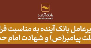 به‌ گزارش باتونیوز به نقل از روابط‌عمومی بانک ‌آینده، دکتر اسکندری مدیرعامل بانک آینده؛ با ارسال پیامی سالروز شهادت حضرت امام رضا علیه‌السلام، را به همه شیعیان و خانواده بزرگ بانک آینده، تسلیت گفتند. در متن پیام آمده است: سالروز شهادت حضرت امام رضا علیه‌السلام تسلیت باد سی‌ام ماه صفر، …