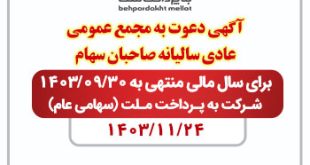 توضیحات بیشتر »آگهی دعوت به مجمع عمومی عادی سالیانه صاحبان سهام شرکت به پرداخت ملت (سهامی عام) برای سال مالی منتهی به 1402/09/30